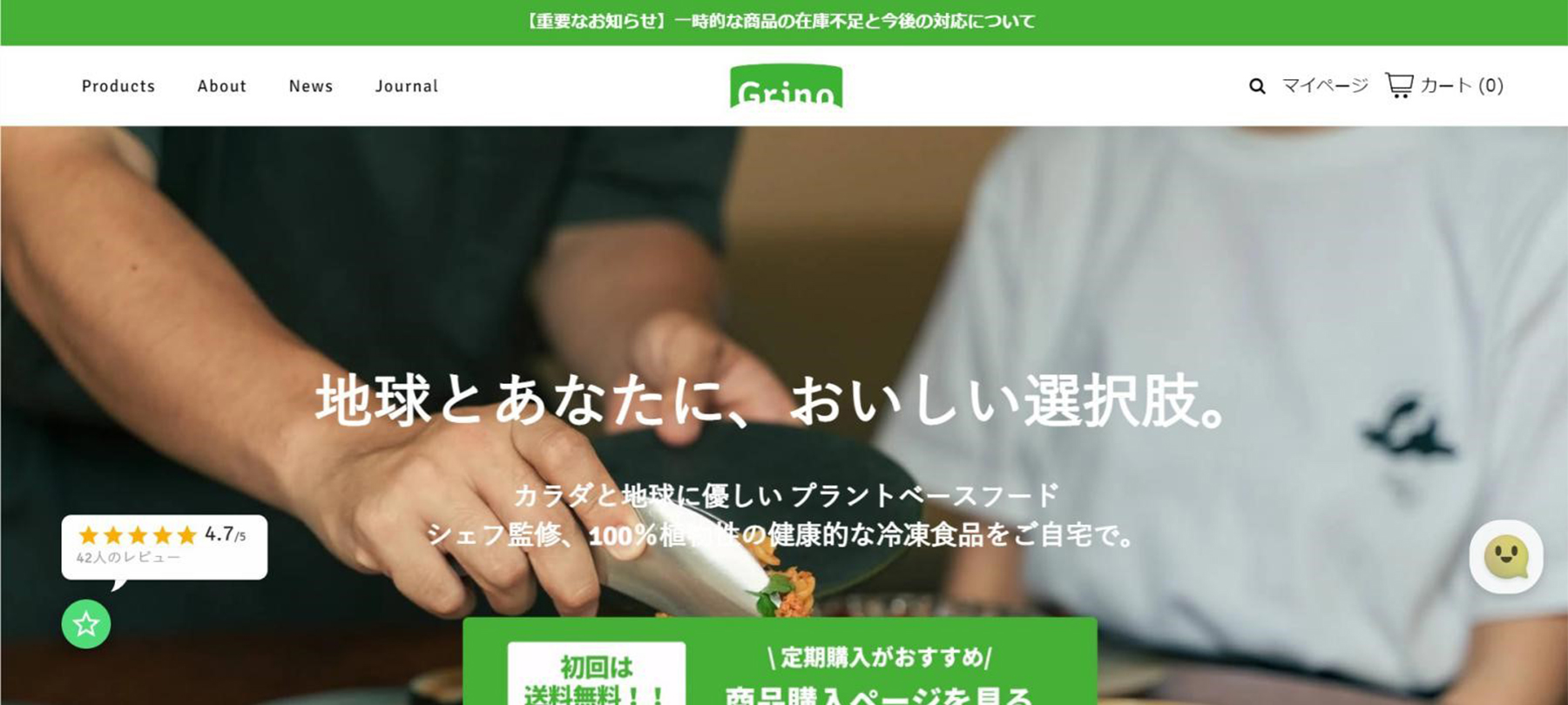 「Grino」は、調理済みの冷凍食品を提供するサブスクリプションサービスです。植物性食品(プラントベースフード)を提供しており、その点がエシカル消費に深くかかわってきます。