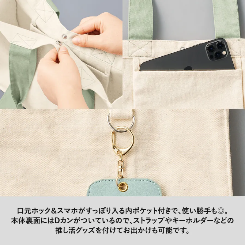 バッグ裏側にストラップを付けられる金具付きで推し活グッズを付けてお出かけできます。