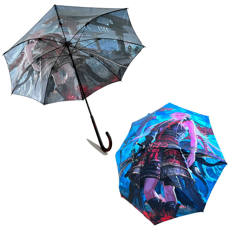 一枚布を使った傘のプロダクト。縫い代が少なく、大きな一枚イラストや模様を活かしたデザインが可能。インクジェット印刷なので、色数の制限もありません。限定品など、特別なグッズ製作におすすめの逸品です。